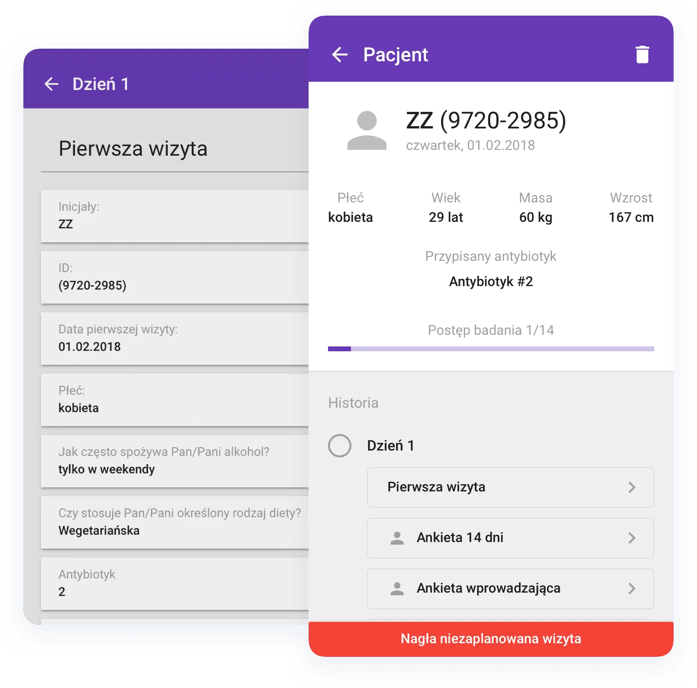 Projekt aplikacji dotyczący przeprowadzenia badania klinicznego oraz jego ewaluacji na grupie pacjentów testujących nowe rozwiązania medyczne. Aplikacja została rozbudowana również o system monitorujący codzienną jakość życia pacjenta oraz analizę danych.